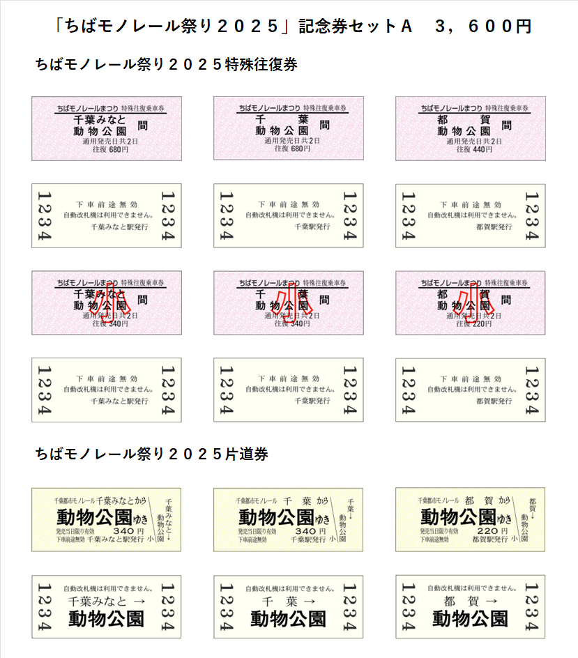 セットの組み合わせは、ちばモノレール祭り2025記念券セットA
